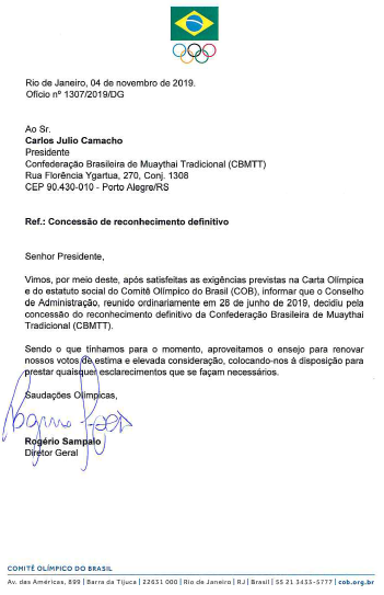 No dia 19 de dezembro de 2017 entra para a história do Muaythai mundial como o dia em que foi realizada a primeira reunião entre a CBMTT e COB – Comitê Olímpico do Brasil. O Muaythai, através da sua entidade mater, a IFMA, foi reconhecido como modalidade olímpica pelo COI – Comitê Olímpico Internacional no dia 06 de dezembro de 2016.