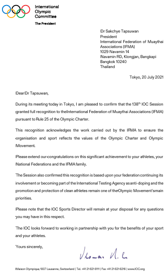 A CBMTT segue em seus eventos as normas internacionais da IFMA, sendo a única entidade no país que será responsável pelo Muaythai olímpico, pois é a única no Brasil oficialmente filiada a IFMA. Em abril de 2012, a IFMA marcou o lançamento oficial do “Muaythai em direção COI”, campanha que em um evento de gala especial, apresentou a sua carta de Intenções para o Comité Olímpico Internacional (COI) para reconhecimento do membro executivo do COI, Dr. CK Wu. Ao mesmo tempo um pedido para ser incluído nos Jogos Mundiais de 2017 foi entregue ao Sr. Ron Froehlich, na época presidente da Associação Internacional dos Jogos Mundiais. Além disso, no atendimento do presidente do SportAccord Sr. Hein Verbruggen.