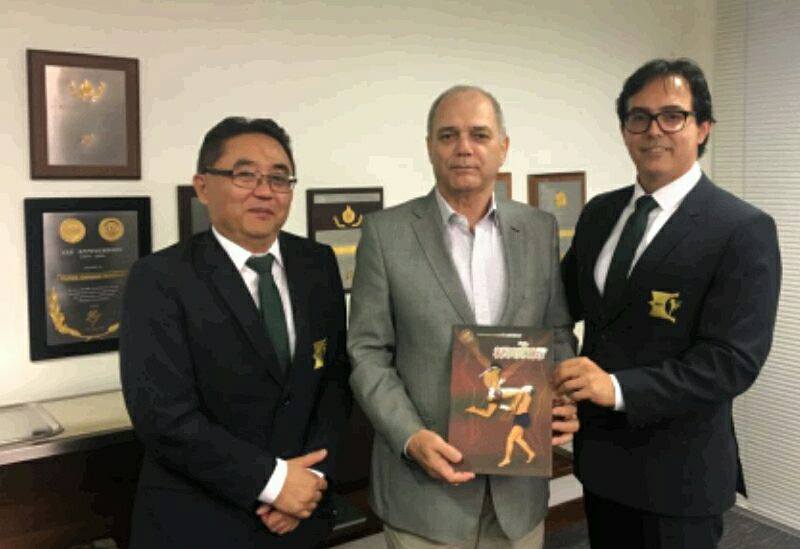 Na foto da esquerda para a direita: Sr. Shindi Arimori - Vice-presidente da CBMTT à época; Sr. Paulo Wanderley Teixeira - Presidente do COB e; Mestre Carlos Camacho - Atual Presidente da CBMTT. Esta visita torna-se um divisor de águas na história do Muaythai brasileiro pois a modalidade passa a fazer parte da elite do desporto mundial.